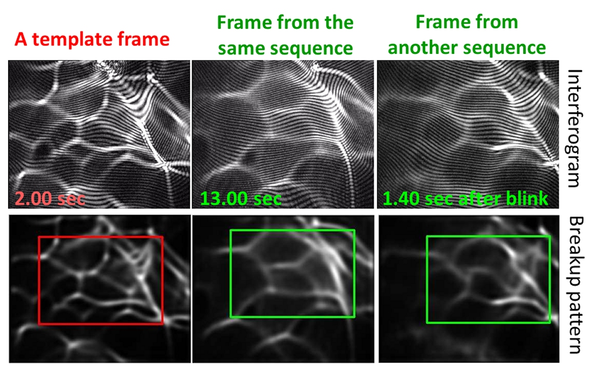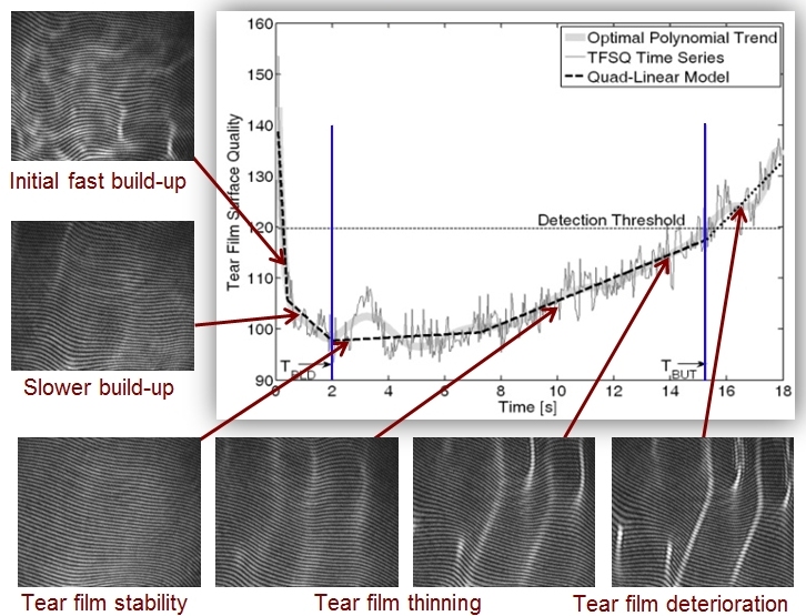 | The tear film that covers the anterior corneal surface has a dynamic behavior. It is well established that immediately after a blink, the tear film undergoes formation (build up) that is followed by a phase of relative tear film stability. However, if the eye is left open for a sufficiently long period of time, the tear film will deteriorate and break-ups in tear film will appear. For those diagnosed with a dry eye syndrome the tear film break-ups appear much sooner. Lateral shearing interferometry (LSI) has been used to objectively and quantitatively assess the tear film surface quality in a noninvasive manner of normal and dry eye subjects. Using a series of cases, we showed that LSI equipped with a set of robust parameter estimation techniques was able to characterize up to five different phases of tear film surface kinetics that include: (i) initial fast tear film build-up phase, (ii) further slower tear film build-up phase, (iii) tear film stability, (iv) tear film thinning, and (v), after a detected break-up, subsequent tear film deterioration (see figure). The two-step tear film build-up process is a subject of our current study. We aim to develop new LSI technology with focus on post-blink changes in tear film surface quality and determine key physical parameters of this phase, that may carry important information regarding tear film quality and its behaviour across the whole inter blink interval. |